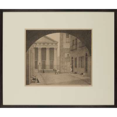 From a numbered edition of forty-five. The artist's son has explained that this work depicts the church of St John the Evangelist, Waterloo Road, London, seen through a railway arch (op.cit.) It is based on an oil painting of the subject made during the winter of 1922-23, whose location is unknown.
