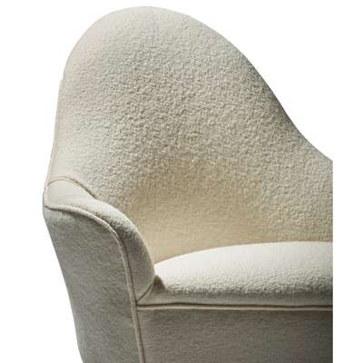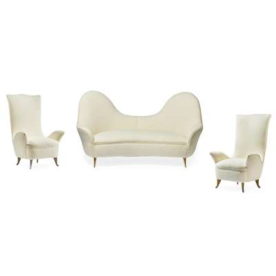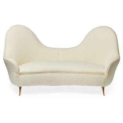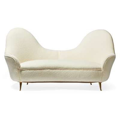 metal manufacturer's label, wool upholstery and brass shaped feet