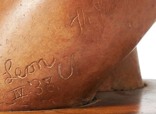 The terracotta “June of Youth” that we see here is numbered IV: the fourth from an edition of four. It is signed with Underwood’s usual signature (“Leon U”), and dated ’38. This must be the date of this specific cast, as a terracotta version was exhibited at the National Society of Painters, Sculptors, Engravers and Potters as early as 1933. The title is lightly inscribed, running up the outside of the left thigh. Incised circles mark the figure’s nipples and navel, with fine lines separating the abdominal muscles and defining the belly.