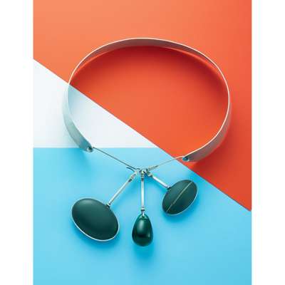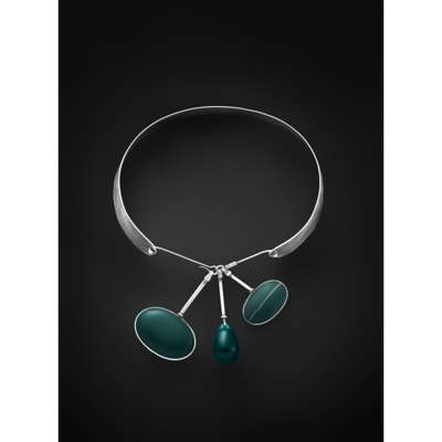 with polished pebble and green glass drops, the hammered collar faintly stamped 'TORUN', and each pendant drop stamped 'TORUN', and two of the drops with further stamped hallmark