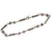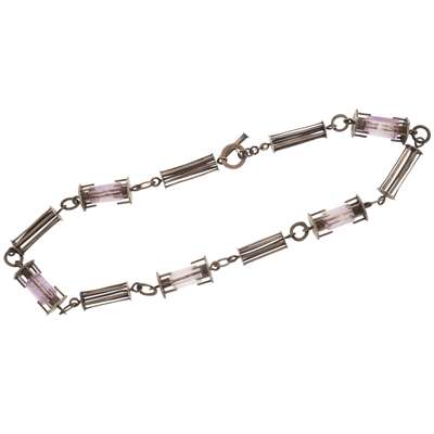 Amethyst and oxidised silver, hallmarked for London 1997, composed of cage-like links set at intervals with polished amethyst crystals, to a T-bar and hoop clasp