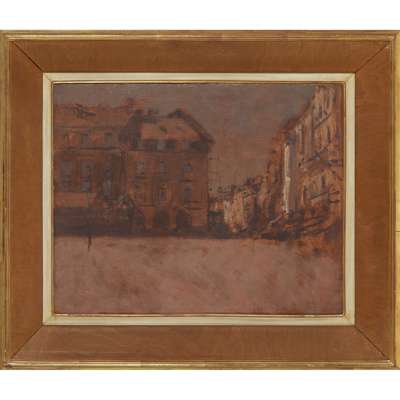 Walter Sickert visited Dieppe for the first time in 1879, and regularly returned to live and work there. This view shows La Grand Rue from the Place Nationale, and the shops lining the street receding into the background. Apart from extended stays in Venice, between 1898 and 1905, Sickert focussed most of his work on Dieppe and made many paintings in and around the Place Nationale. The concept of an empty foreground, receding street and flat front of shops was a technique that Sickert employed many times in his landscape works of the period, as in this painting.