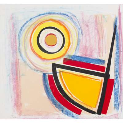 In 1962, O’Casey began experimenting with his own pictorial vocabulary of geometric form. Like Frost, he painted in a uniquely abstract manner, capturing the world around him through a series of circles, triangles and squares, like that in his oil painting Red Sun (Lot 237).