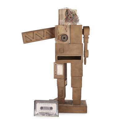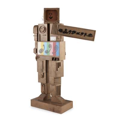 Mini-metrobot is a small editioned maquette for the 26 foot tall Metrobot created as a sidewalk ambassador for The Contemporary Arts Center, Cincinnati, in celebration of the 50th anniversary of the center and 200th anniversary of the city. It was created to communicate the Arts Center’s location, as well as imparting a message of events and exhibitions on its electronic message board arm. There was a public telephone and video monitors in its legs that allowed the public to further interact with the piece.