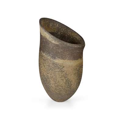 Asymmetric dark mottled, amber bands, ridge, tilted rim vessel, 1988-9
