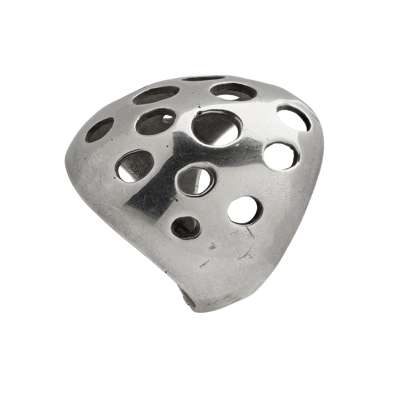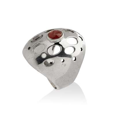 collet set with an oval ruby cabochon, on a domed ground with pierced detail, stamped IBB; together with another similar (2)