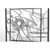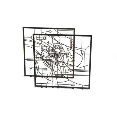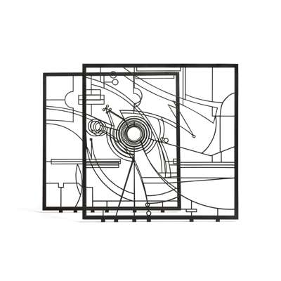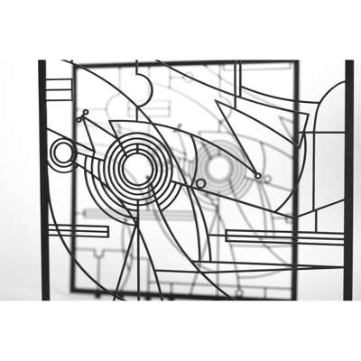 The double screens designed by Wendy Ramshaw were commissioned in 1995 by the Victoria and Albert Museum for the new staff restaurant, and were installed in 1997. The larger screens were cut by computer controlled water jets which enabled the design to be executed without any deviation from Ramshaw's original design. Each was then inset with an optical glass lense and spray painted.