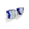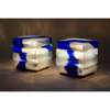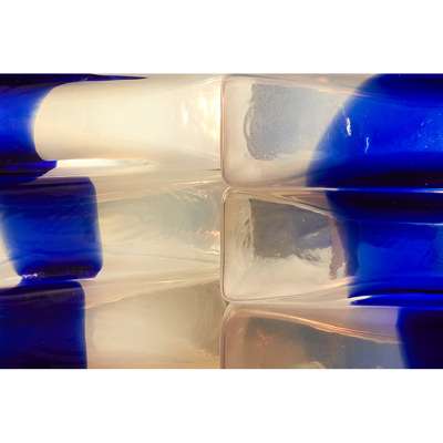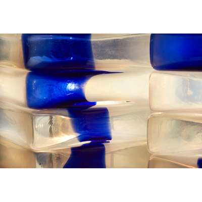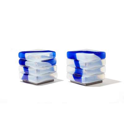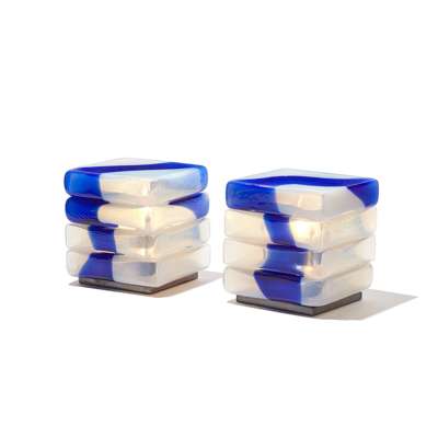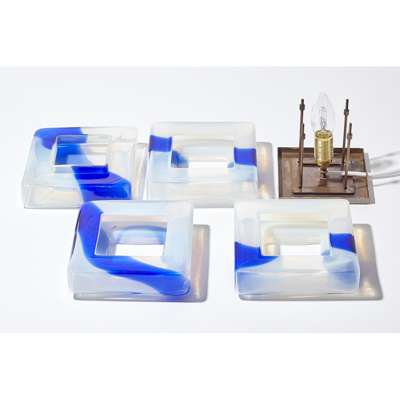 square metal base, supporting four stacking layers of hand blown Murano glass, manufacturer's paper label 'A. V. Mazzega Murano Italy' on one lamp