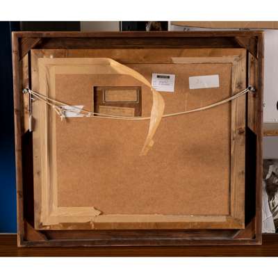 signed (lower right), dated to label (to reverse), oil on canvas laid on board