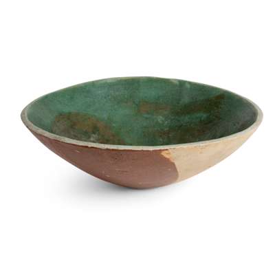 partially incised initials, stoneware, deep green glaze to the inside of bowl