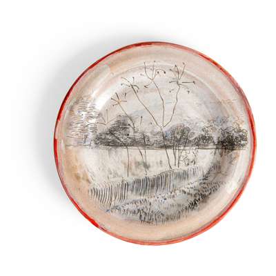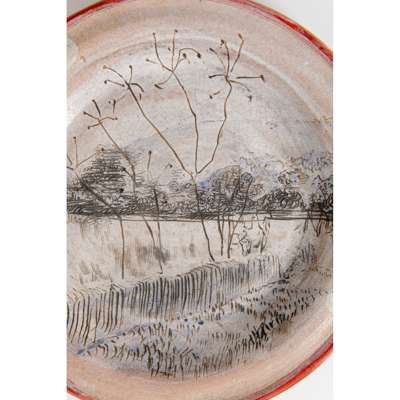 inscribed 'Fulham Pottery / Quentin Bell' and stamped pottery marks, earthenware incised with design of landscape