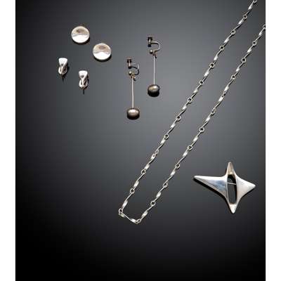 model 339, silver, stamped Georg Jensen mark, '925s Denmark', and with import marks; necklace, model 2380, silver, stamped Georg Jensen mark, '925s Denmark'; Vivianna Torun Bülow-Hübe, pair of drop earrings, silver, stamped Georg Jensen mark, '925', and with import marks; Edvard Kindt-Larsen, pair of earrings, silver, model 116A, stamped Georg Jensen mark '925S Denmark'; Nanna Ditzel, pair of earrings, silver, model 1360, stamped Georg Jensen mark '925S Denmark'