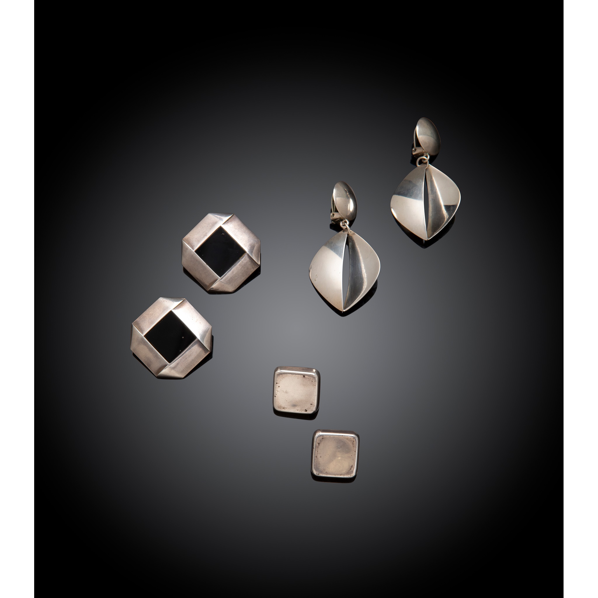 Allan Schraff silver and black onyx earrings, model 209; Regtiz Overgaard silver drop earrings, model 380B and Astrig Fog square silver earrings, model 191, each stamped with Georg Jensen mark, model numbers and '925S Denmark', the Astrig Fog earrings with import marks