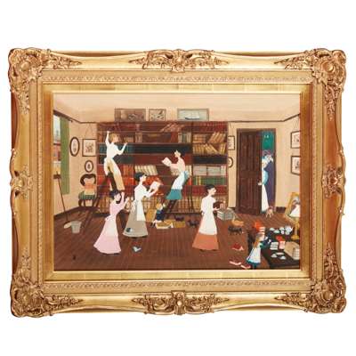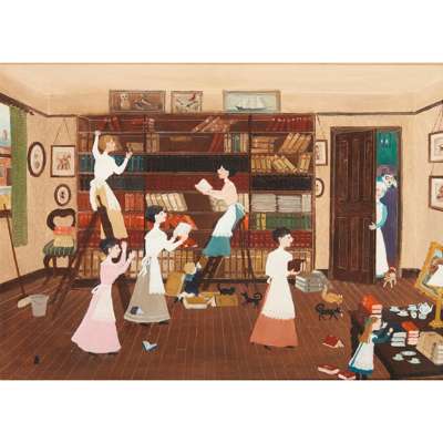 'The Glorious day Spring Cleaning began... Aunt Mary, Aunt Frances, Aunt Charlotte, also Miss Carter (who wore Pink) called at our house ready to start on Father's Room. Everyone was having a delightful time. Aunt Frances sat on the stepladder reading something that made them all laugh. They loved Father's books on the top shelf and they read so much with such joy that it took them a week to do out the bookcases, but just when everyone was thoroughly enjoying themselves including George & I who were building houses with books, young Sarah opened the door and announced Mrs Hope-Ainsworth. "Oh dear", said Miss Carter, dropping her books, "we've all got our aprons on", and the year was 1906. Helen Rayfield Bradley, 1971' (to label to reverse).