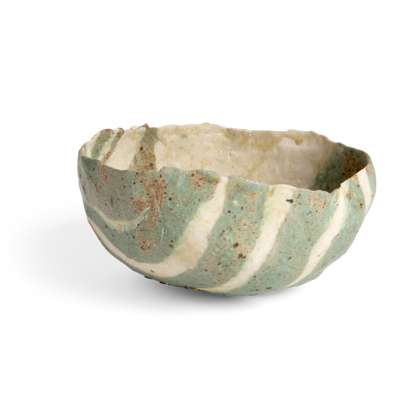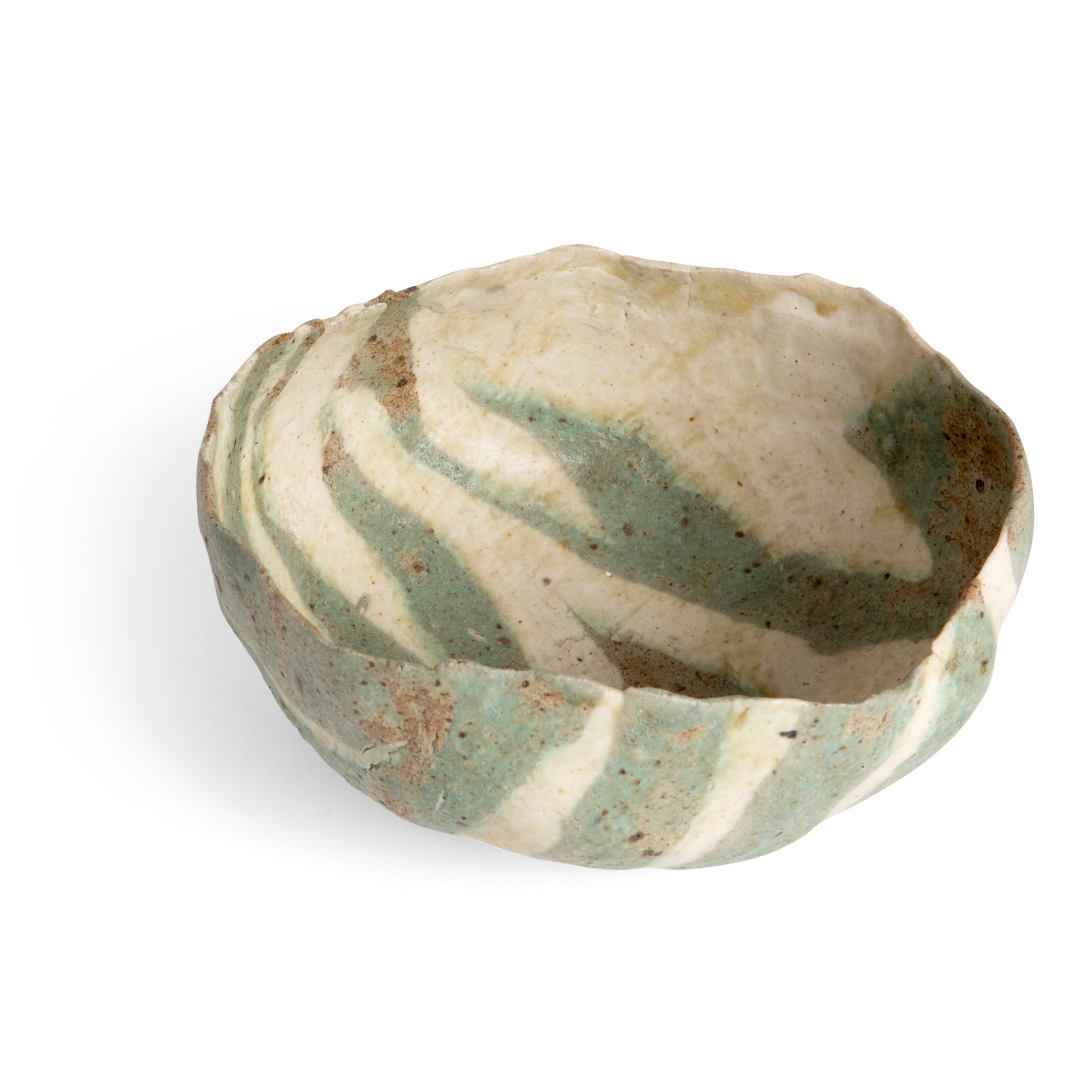 mixed laminated clays, with dark green and mottled cream glazes