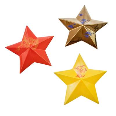 one signed and dated and another dated (to reverse), wall-mounted ceramic stars with dragon and flaming pearl motifs, in individual presentation boxes
