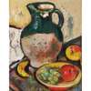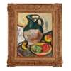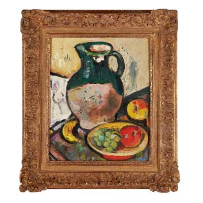 Hunter returned to still-life compositions throughout his career, often re-using objects in different iterations to generate the effect he was looking for. Here, the simple outline and two-tone colour of the jug fill the composition but this simplicity is enlivened with Hunter’s expressive brushwork both in and around the object while the composition is brightened with the inclusion of various colour-rich fruit in the foreground. Hunter achieves a sense of balance across the composition as the vertical lines of the table edge and the white canvas in the background intersect behind the jug, drawing our attention inwards. As we might expect from a Scottish Colourist, Hunter plays with colour here, juxtaposing the deep green jug with the zingy orange fruit and incorporating dashes of purple, yellow and blue-grey into the backing wall, and to gently suggest the patterned tablecloth. Hunter is at his most subtle here and with this sophistication, the more you look the more there is to see.