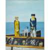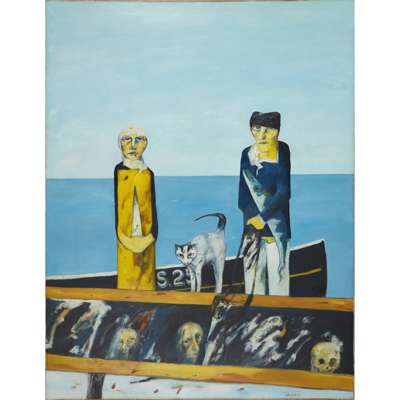 The painting utilises both religious and personal iconography. By using the triptych format, Bellany makes explicit visual reference to the church before setting forth his own personal perspective on the human condition, and the hope we so require. He moves into his own personal iconography, the figures and creatures that recur in many of his works: fishermen, the monkey, cat, dog and bird, fish and their skeletons, boats and coffins. These representations appear across the three panels but the move from darkness to hope is most clearly signified through his choice of colour. Across the composition, he uses his standard palette, with significant use of blue, red, green and yellow. But there is a distinction made between the calm blue that guides the centre piece and does not appear elsewhere – the colour of a calm sea becomes the colour of hope. The natural world that provides, the sea, and the men who are able to harness its resource, the fisherman, are the future and provide potential.