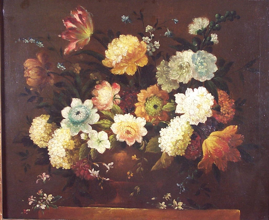 A STILL LIFE OF ASSORTED FLOWERS IN A BRONZE URN