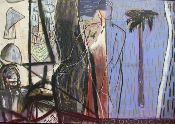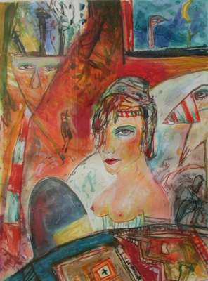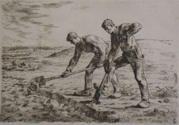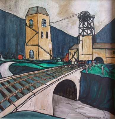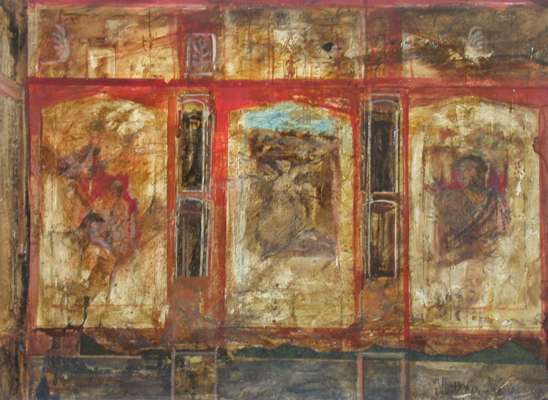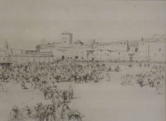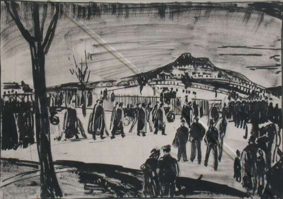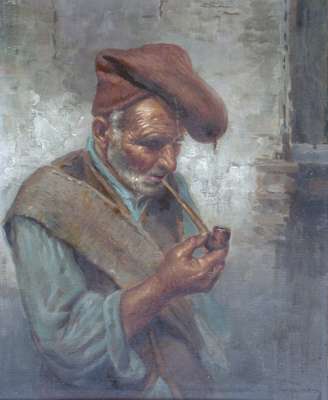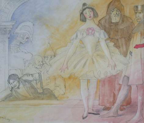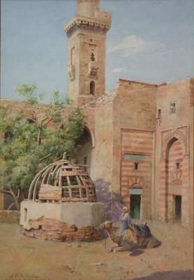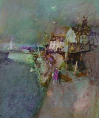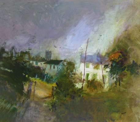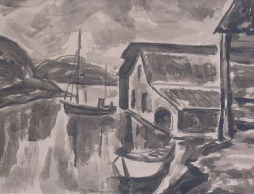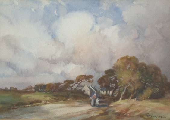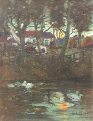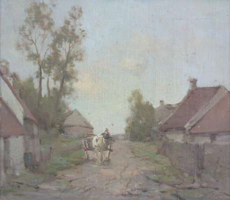 A COUNTRY TOWN WITH FIGURE BY A WATERPUMP