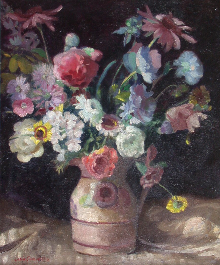 A STILL LIFE OF ASSORTED FLOWERS IN A JUG