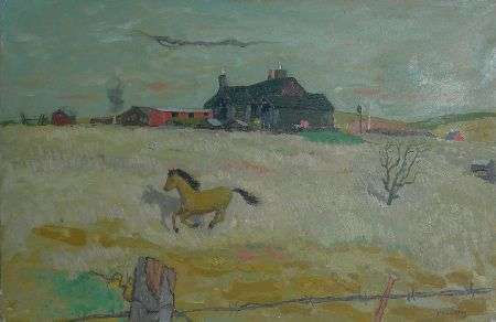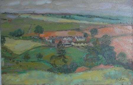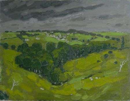 76cm x 102cm (30in x 40in) and another five by the same hand 'Race to Aberdeen', 'Cotswold Landscape', 'Field near Shaw', 'Village in Valley' and Race to Aberdeen' (6)