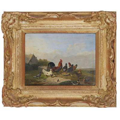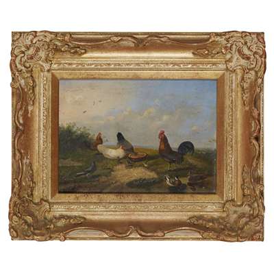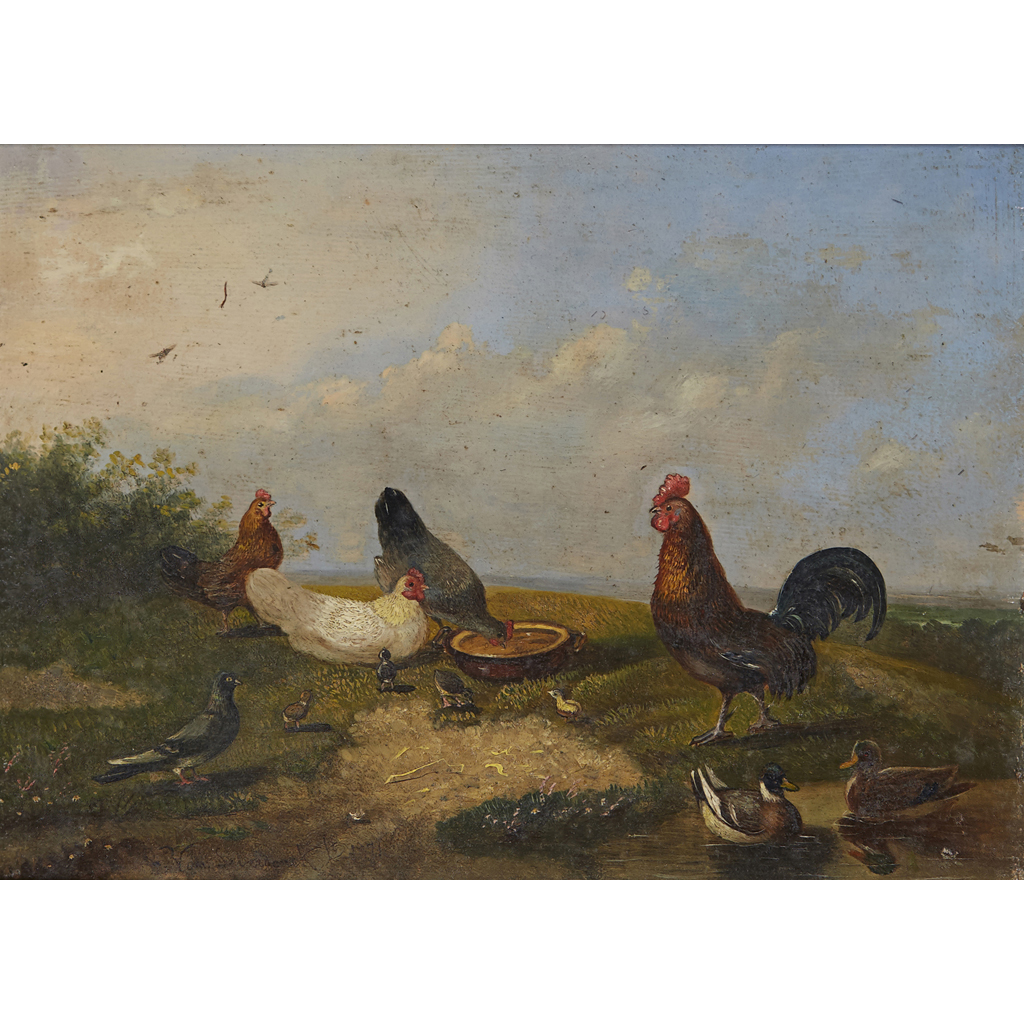 CHICKENS AND DUCKS FEEDING ON A RIVERBANK