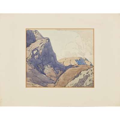 22.5cm x 26cm (8.75in x 10.25in) and a further unframed watercolour by the same hand 'Indigo Cliffs' (2)