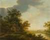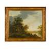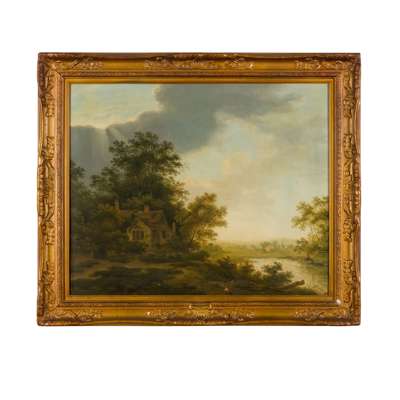 A WOODED RIVER LANDSCAPE WITH FISHERMAN