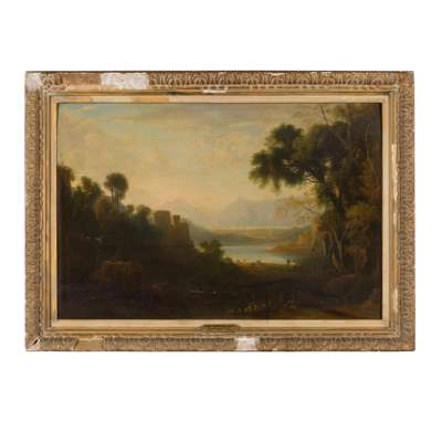 A WOODED RIVER LANDSCAPE WITH RUINED CASTLE