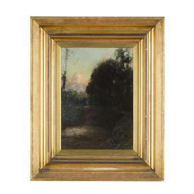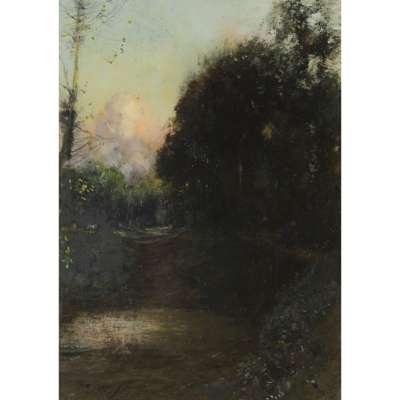 A WOODED RIVER LANDSCAPE DUSK