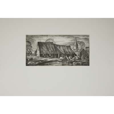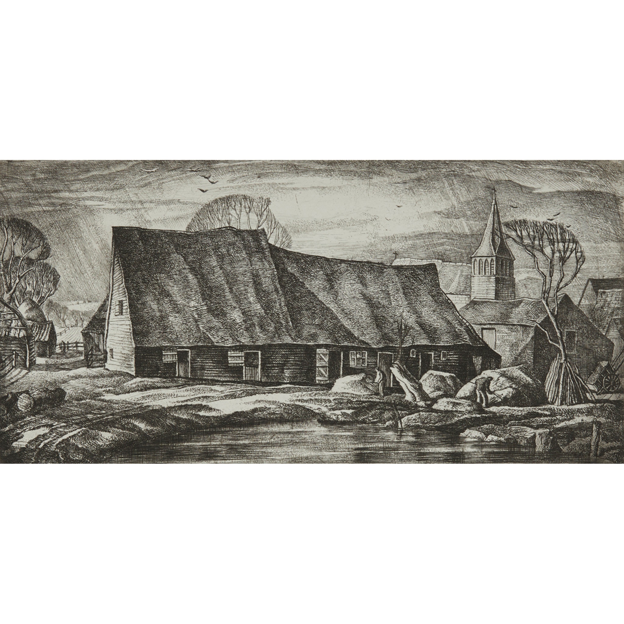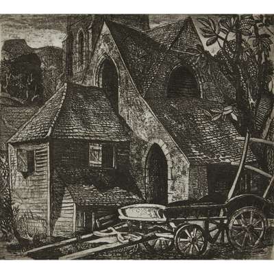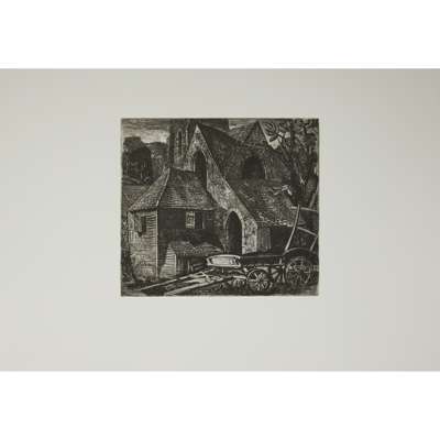 Etching, and another, 'Gothic Barn', etching