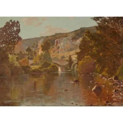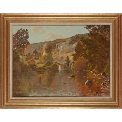 BRIDGE IN A WOODED RIVER LANDSCAPE