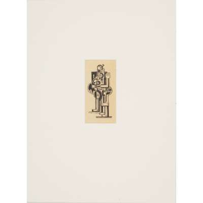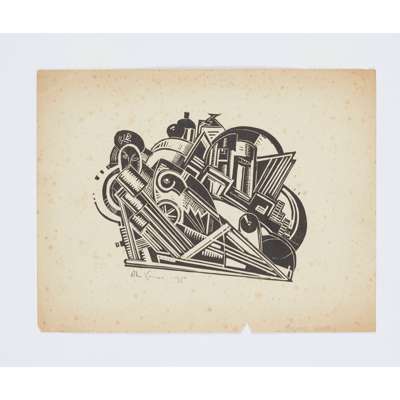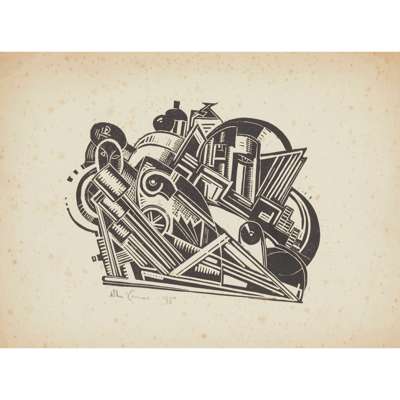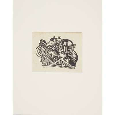 and a companion, a woodcut, signed and dated 1930 in pencil to margin lower left, inscribed with title 'Machine Gods' lower right