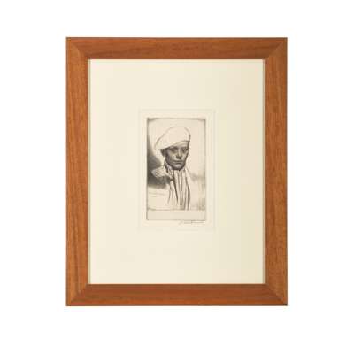 Brockhurst had experimented with printmaking in the 1910s, but it was not until the early ‘20s that he committed to etching in earnest. In a market increasingly oversaturated with etchings of landscapes and urban views, Brockhurst concentrated on portraiture, many of which were transpositions of compositions he had painted in the late 1910s and early ‘20s. He soon achieved distinction for his rendering of skin, hair and textiles with astonishing naturalism. Each composition is imbued with a refined stillness, with flesh that appears almost to glow and to possess conceivable weight and mass.