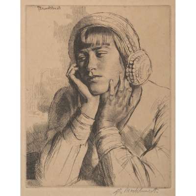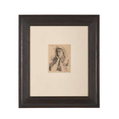 Brockhurst had experimented with printmaking in the 1910s, but it was not until the early ‘20s that he committed to etching in earnest. In a market increasingly oversaturated with etchings of landscapes and urban views, Brockhurst concentrated on portraiture, many of which were transpositions of compositions he had painted in the late 1910s and early ‘20s. He soon achieved distinction for his rendering of skin, hair and textiles with astonishing naturalism. Each composition is imbued with a refined stillness, with flesh that appears almost to glow and to possess conceivable weight and mass.