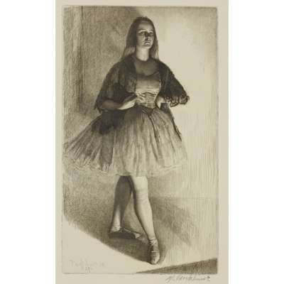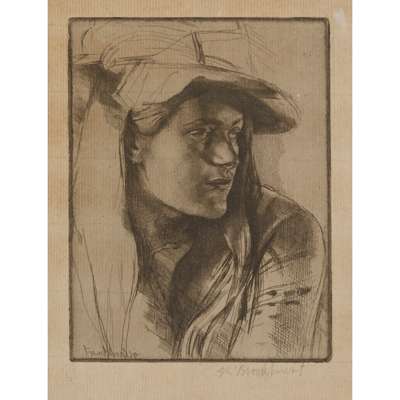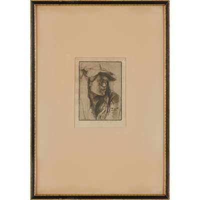 Brockhurst had experimented with printmaking in the 1910s, but it was not until the early ‘20s that he committed to etching in earnest. In a market increasingly oversaturated with etchings of landscapes and urban views, Brockhurst concentrated on portraiture, many of which were transpositions of compositions he had painted in the late 1910s and early ‘20s. He soon achieved distinction for his rendering of skin, hair and textiles with astonishing naturalism. Each composition is imbued with a refined stillness, with flesh that appears almost to glow and to possess conceivable weight and mass.