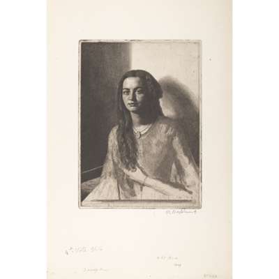 Brockhurst had experimented with printmaking in the 1910s, but it was not until the early ‘20s that he committed to etching in earnest. In a market increasingly oversaturated with etchings of landscapes and urban views, Brockhurst concentrated on portraiture, many of which were transpositions of compositions he had painted in the late 1910s and early ‘20s. He soon achieved distinction for his rendering of skin, hair and textiles with astonishing naturalism. Each composition is imbued with a refined stillness, with flesh that appears almost to glow and to possess conceivable weight and mass.