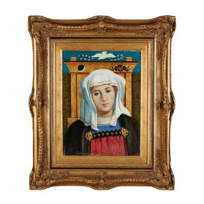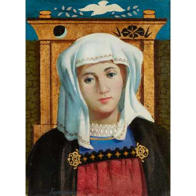 Indistinctly inscribed lower-left edge, signed and inscribed with title verso, oil and gold paint on canvas board