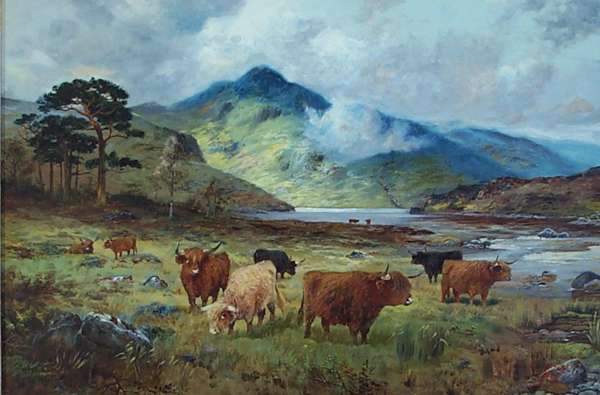 HIGHLAND CATTLE GRAZING IN A MOUNTAIN GLEN