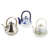each of baluster ovoid form with applied handle, one decorated in blue on white with storks, printed makers mark MINTON/ STORK, 19.5cm high; the other printed and painted in gilt and coloured enamels with a frieze of cornflowers, impressed maker's mark MINTON, 18.5cm high; and a PLATED TEAPOT, attributed to Hukin & Heath, of corresponding shape, chased with an allover foliate design, unmarked, 18cm high (3)