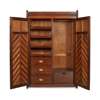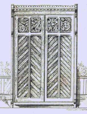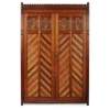 the castellated cornice above twin doors each with chevron tongue and groove panels, and four further panels carved in relief with stylised foliage, enclosed to the angles with turned and incised uprights, and enclosing a hanging space