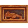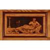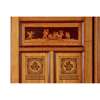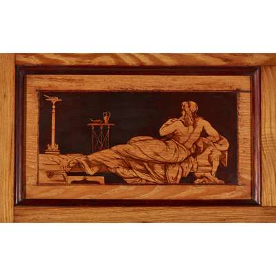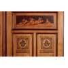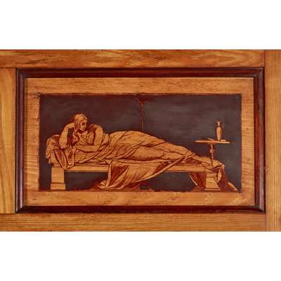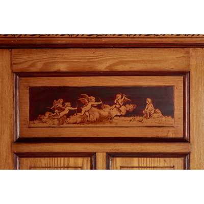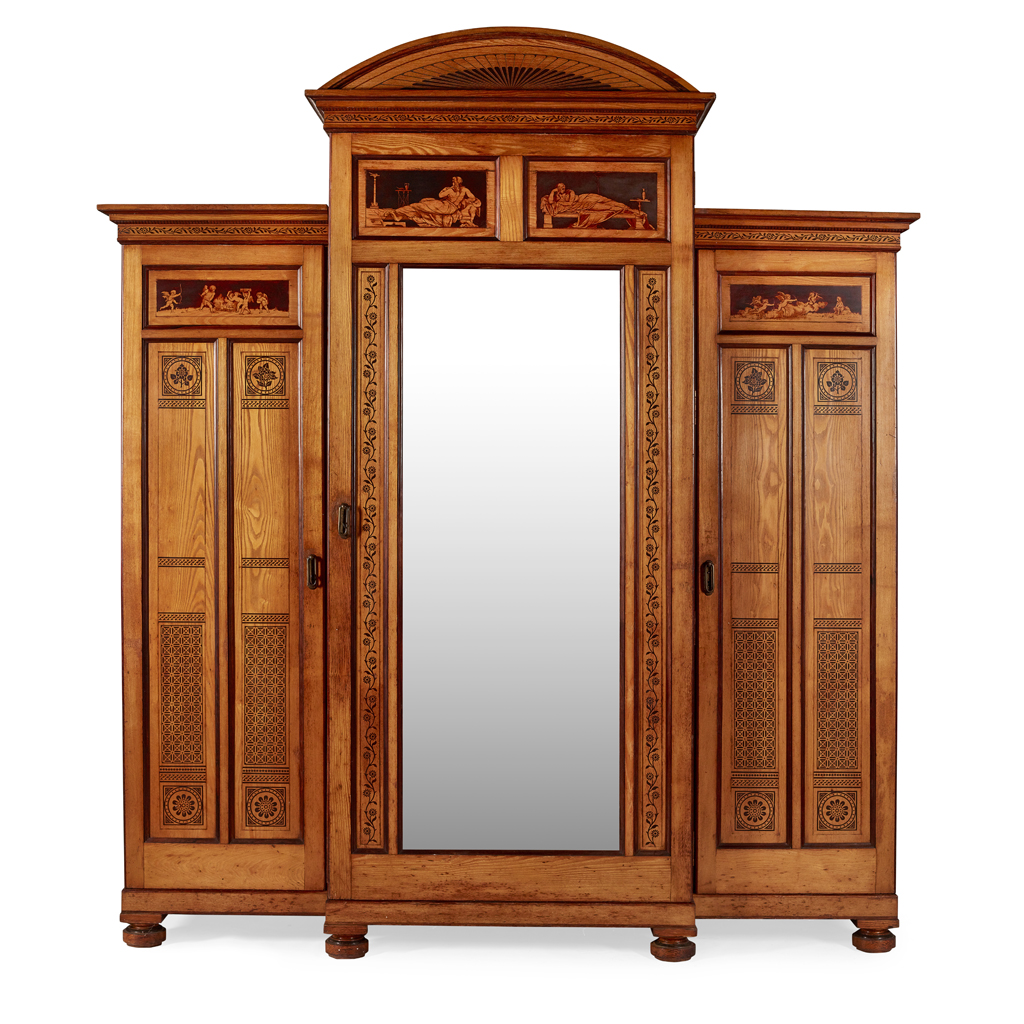 with arched architectural pediment the breakfront comprising three sections, with four en grisaille painted panels depicting recumbent classical maidens and cavorting cherubs, enclosed by stencilled borders of diaper work, foliage and flowerheads and line inlay, the central section with a mirror, flanked by two cupboard doors, opening to fitted drawers, sliding shelves and linen-lined hanging spaces, decorated to the sides, the whole raised on squat bun feet, with keys