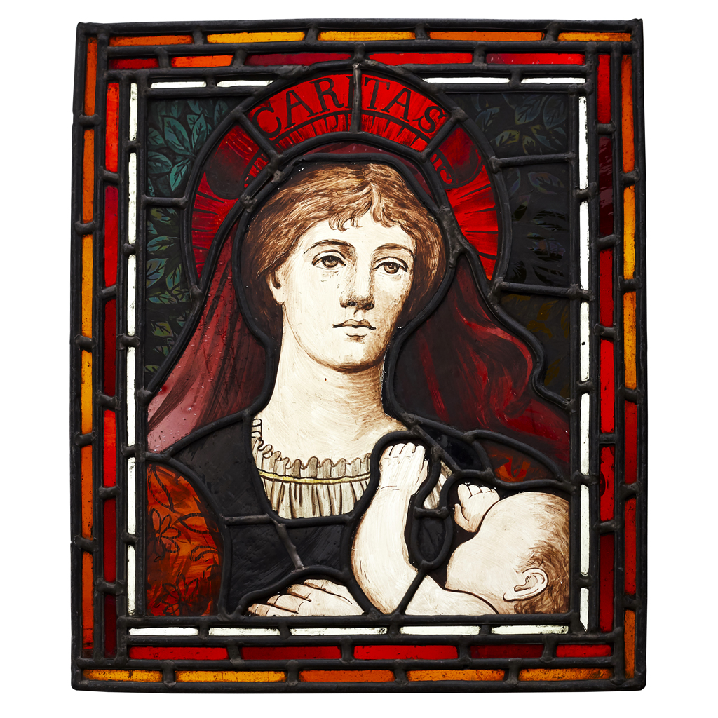 depicting a mother and child, reserved on a foliate ground within multiple borders, bears inscription CARITAS (Virtue)