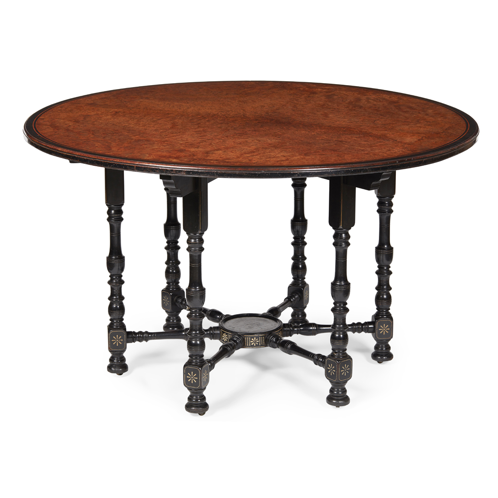 AESTHETIC MOVEMENT BURR WALNUT AND EBONISED CENTRE TABLE, CIRCA 1880