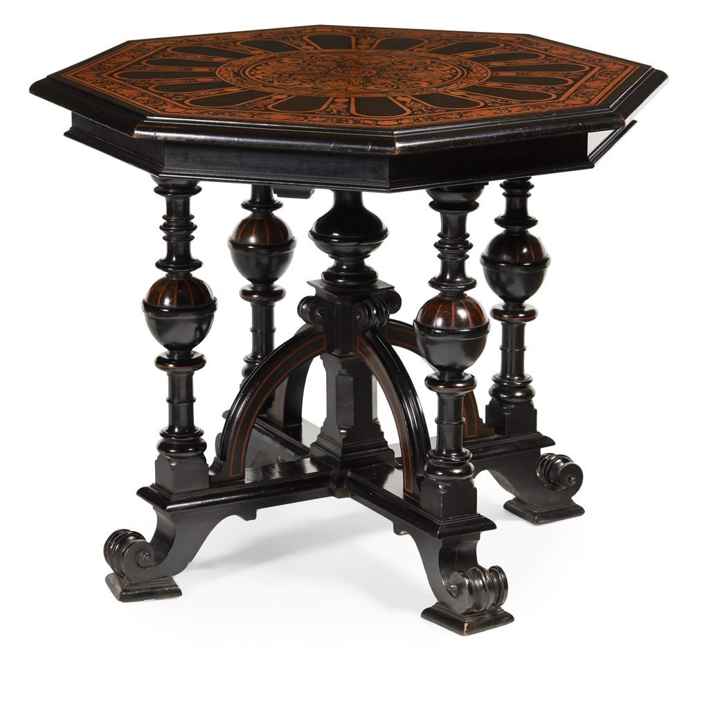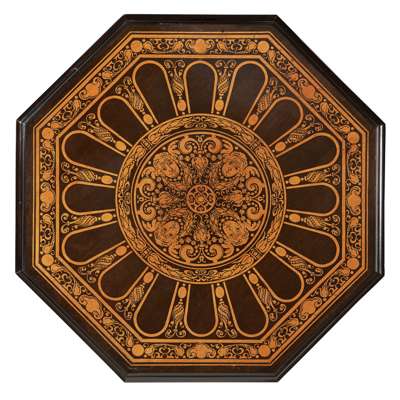 the octagonal top with moulded edge, profusely inlaid with a marquetry panel depicting opposed masks and stylised foliage, raised on turned and blocked legs, linked by stretchers and curved brackets, terminating in scroll feet