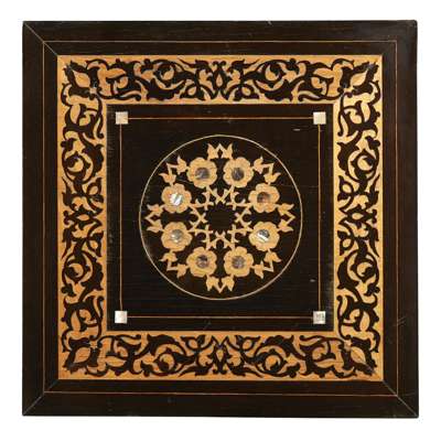 inlaid with mother-of-pearl, the square top with stylised foliate decoration above a frieze with corresponding decoration raised on square legs linked by an inlaid tier