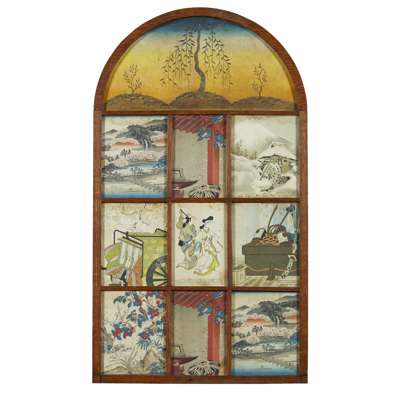 the arched and divided frame filled with fragments from 19th century Japanese prints