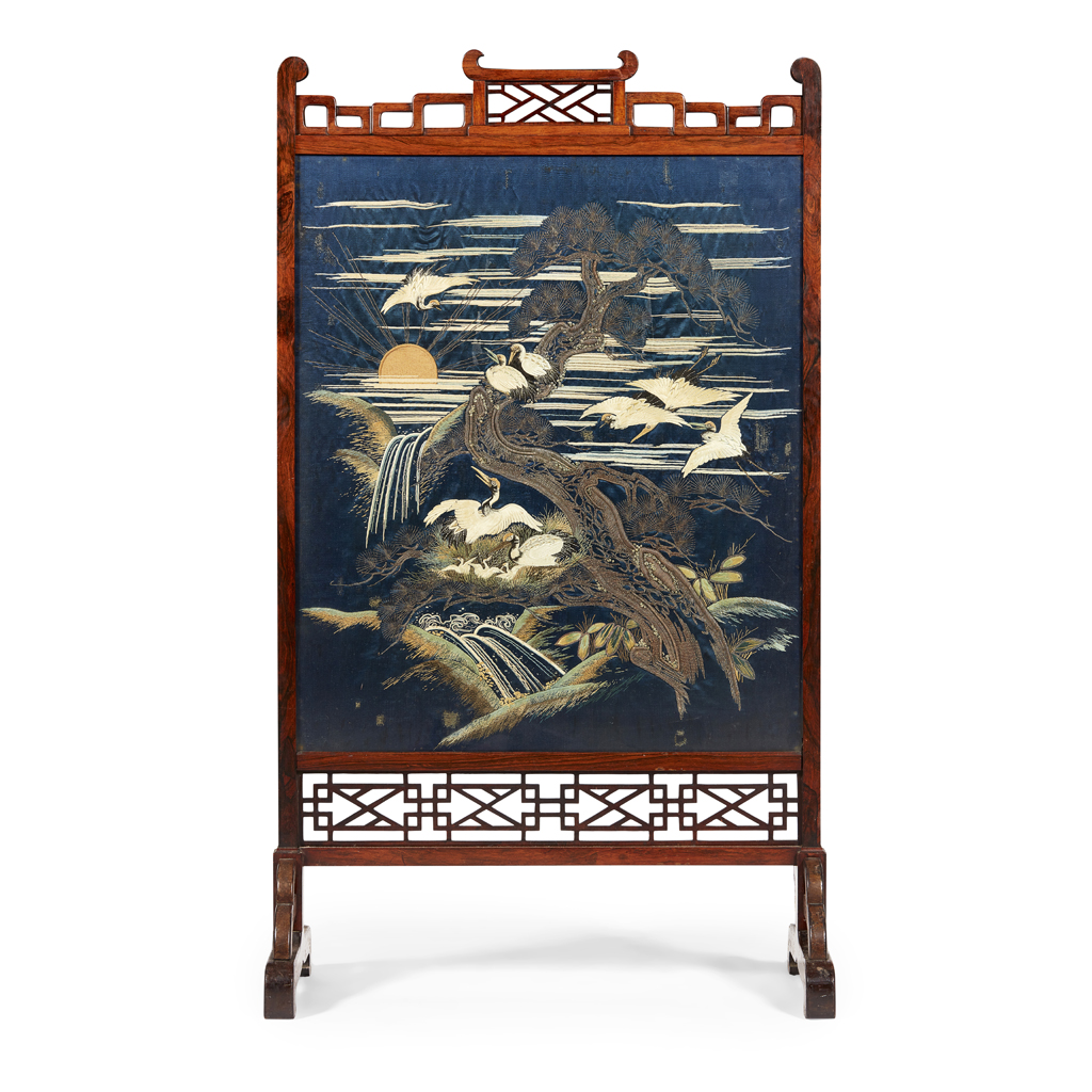 with curved uprights enclosing a pierced frieze above a rectangular glazed panel of embroidered Meiji period silk fabric depicting cranes in a landscape, surmounting a further pierced geometric frieze on domed curved legs