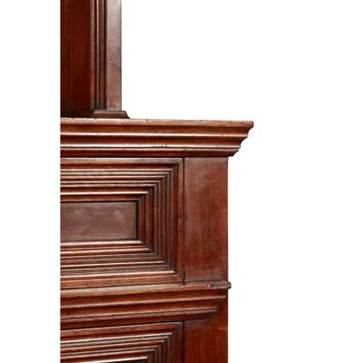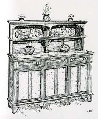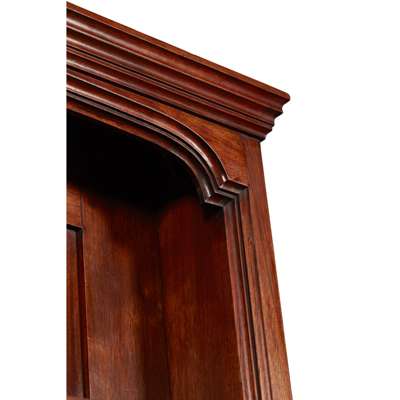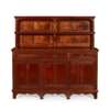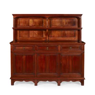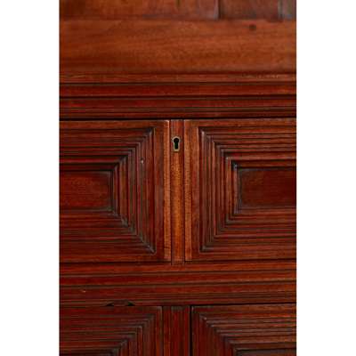 the moulded cornice above single plate shelf with bracket support, the rectangular moulded top above three panelled drawers and three corresponding panelled doors below, the whole raised on block feet united by ogee aprons